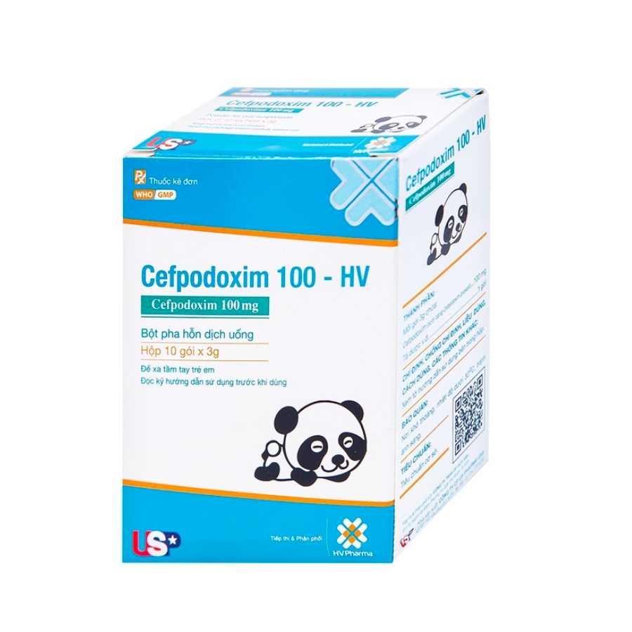 Thuốc “Cefpodoxim 100-HV” là sản phẩm của công ty CP US Pharma USA, có chứa hoạt chất chính là cefpodoxim 100 mg. Thuốc được chỉ định trong điều trị các bệnh từ nhẹ đến trung bình trong các trường hợp sau: nhiễm khuẩn đường hô hấp trên; đường hô hấp dưới (kể cả viêm phổi cấp tính mắc phải ở cộng đồng); bệnh viêm tai giữa cấp; nhiễm khuẩn đường tiết niệu thể nhẹ và vừa, chưa có biến chứng; bệnh lậu cấp chưa biến chứng, ở nội mạc cổ tử cung hoặc hậu môn - trực tràng của phụ nữ và bệnh lậu ở niệu đạo của phụ nữ và nam giới; nhiễm khuẩn thể nhẹ đến vừa chưa biến chứng ở da và các tổ chức da.