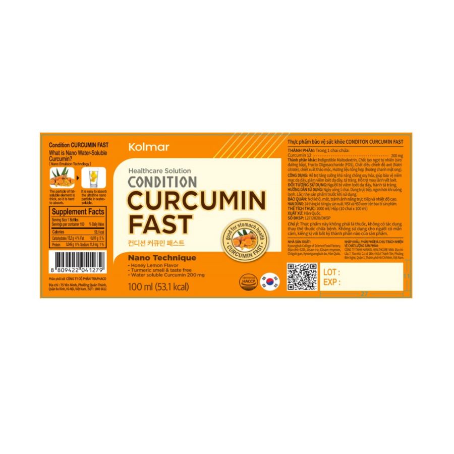 - Condition Curcumin fast là sản phẩm chứa curcumin ở dạng nước uống liền, giúp tăng khả năng hấp thụ.